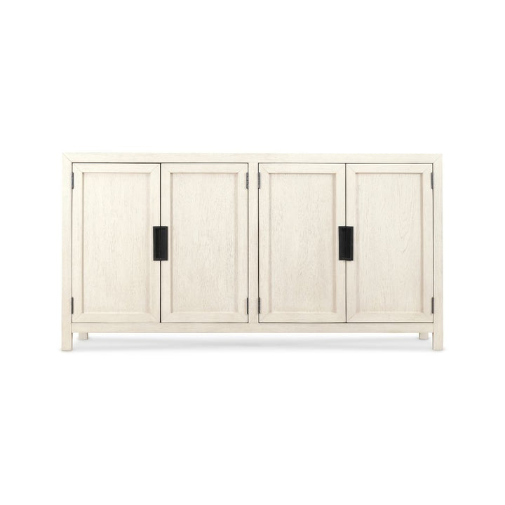 - The Accord 4 Door Sideboard features a modern design crafted from hardwood that highlights a natural grain veneer finish. Available in an elegant white or grey finish, it includes four doors with internal shelving to provide ample, organised storage while adding a stylish touch to any contemporary living space.
