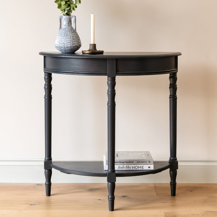 - Elevate your space with the exquisite Anita Black Half Moon Console Table. Its elegant half moon shape, crafted from luxurious Farrow and Ball Off Black Paint, is complemented by intricate turned leg carving. The perfect piece to add a touch of sophistication to any room.
