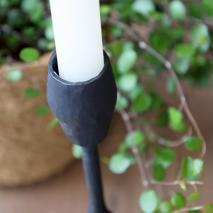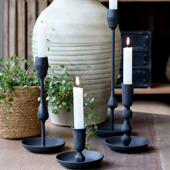 - This Antique Black Candlestick, crafted from sturdy iron, exudes timeless elegance. Its refined design enhances any setting with a vintage charm, offering a sophisticated way to display candles. Perfect for adding a classic touch to your home décor, this piece combines durability with tasteful artistry.