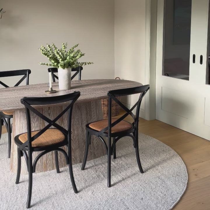 - An understated cross back chair. The distressed natural finish of the cafe chair makes for a perfect addition to any contemporary, casually-styled dining area.