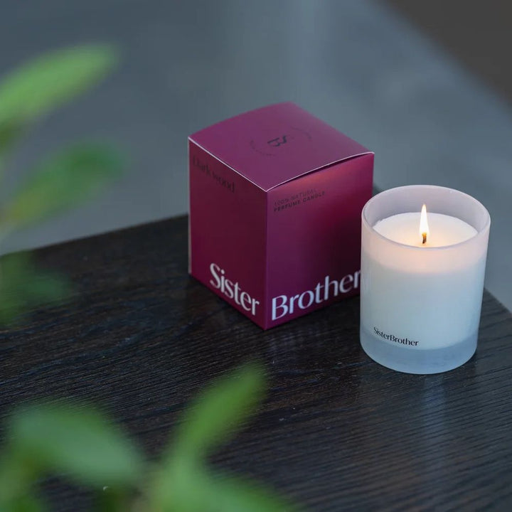 - Experience the refined blend of the Dark Wood Scented Candle - Sister Brother. This sophisticated aroma opens with cedarwood, white amber, and cashmer, creating a warm and inviting base. At its heart, delicate notes of iris, oud, and blackcurrant add depth and complexity. The finish is softened by white berries, violet, and sunflower, offering a balanced and elegant fragrance that enhances any space with subtle luxury.