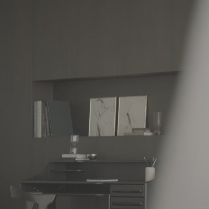 - The Flow collection embodies a graceful sense of motion with its smooth contours and flowing design. Featuring softly rounded corners and elegant curves, each piece reflects a timeless vintage charm paired with contemporary sophistication, ideal for adapting to changing environments. Created to enhance concentration and creativity, the desk’s sleek profile and luxurious finish add a distinctive warmth to any workspace. Constructed from solid mahogany with a varnished surface, its tactile top and open framework offer an inspiring and welcoming area for focused work.