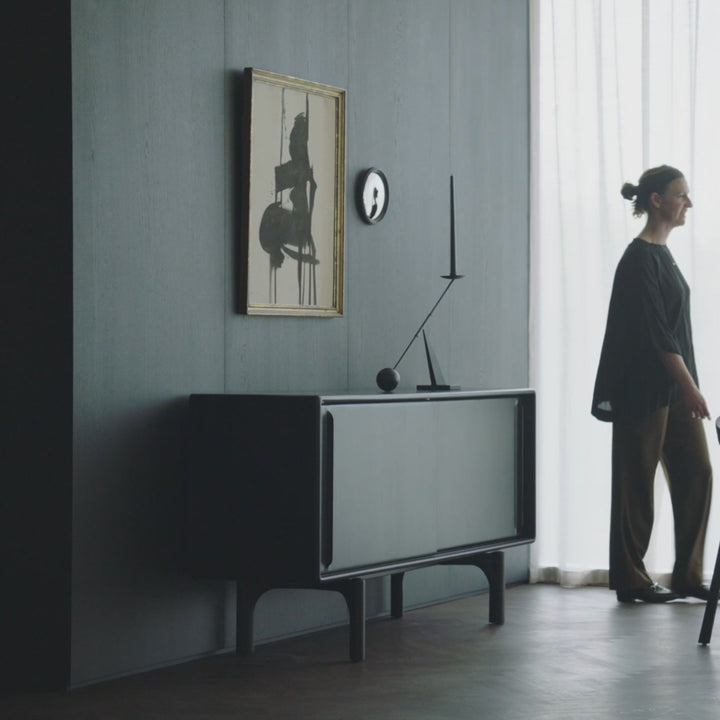 - The Flow collection captures a sense of movement through softened edges and fluid lines. With gently rounded corners and subtle curves throughout, each piece exudes a vintage spirit with a refined, modern attitude, poised to complement evolving spaces and needs. The sideboard’s generous top and internal shelving offer practical storage with visual appeal. Crafted from solid mahogany with a rich varnish finish that highlights the natural grain, it stands on distinctive legs that lend a light, elevated stance to this functional classic.