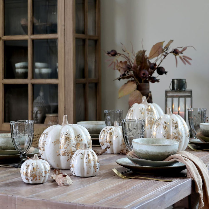 Golden Glow Pumpkin - Elevate your seasonal decor with the Golden Glow Pumpkin, a refined ceramic piece featuring elegant golden detailing. Available in three sizes, it offers versatile styling options—display a harmonious set or showcase individual pumpkins for a subtle yet sophisticated touch. Perfect for adding warmth and timeless charm...