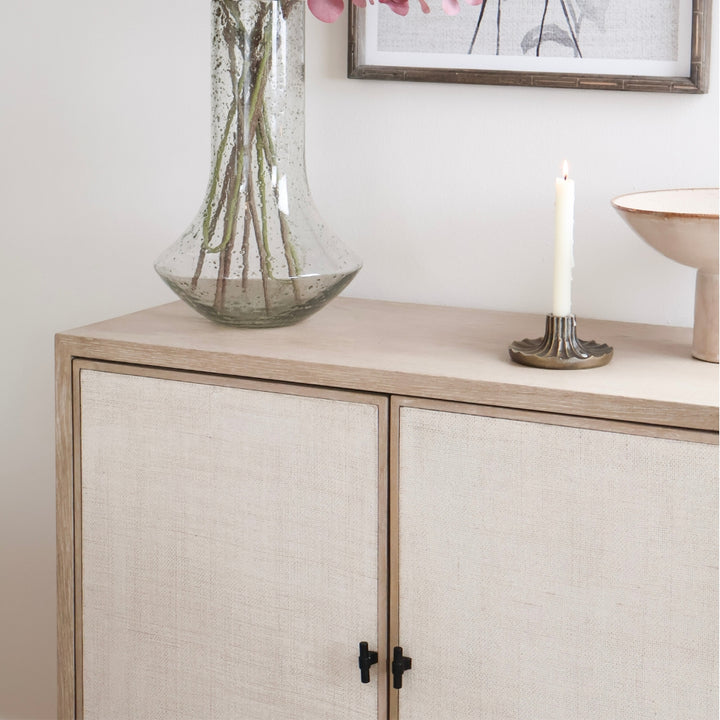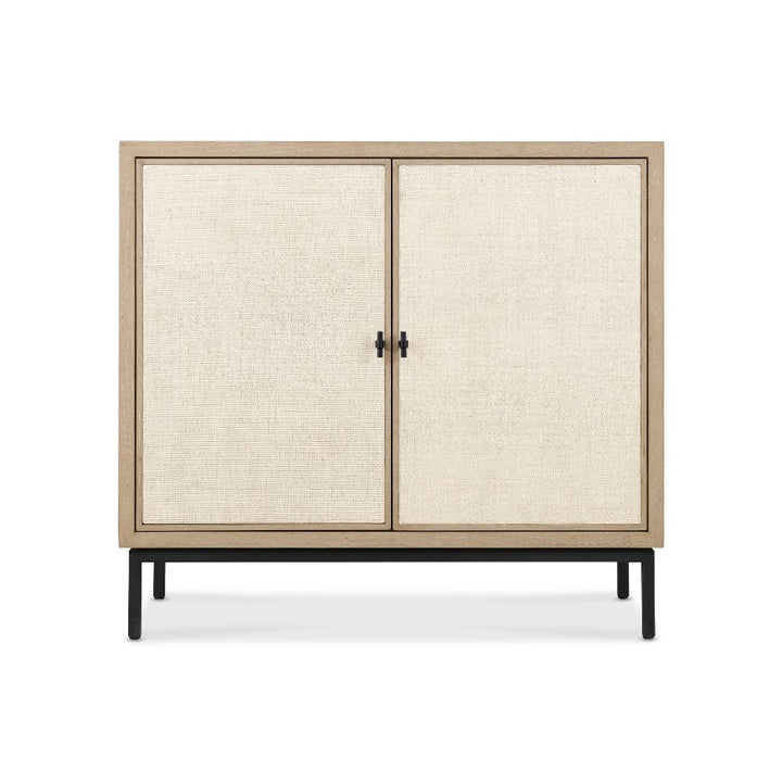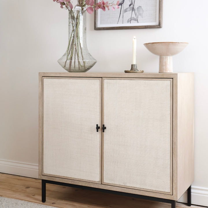 2 Door Wood Sideboard - The Hush 2 Door Sideboard combines rich hardwood with a natural grain veneer finish and textured doors for a refined look. Inside, an internal shelf provides practical storage, while sleek black legs offer sturdy support and a modern touch. This elegant piece seamlessly blends stylish...