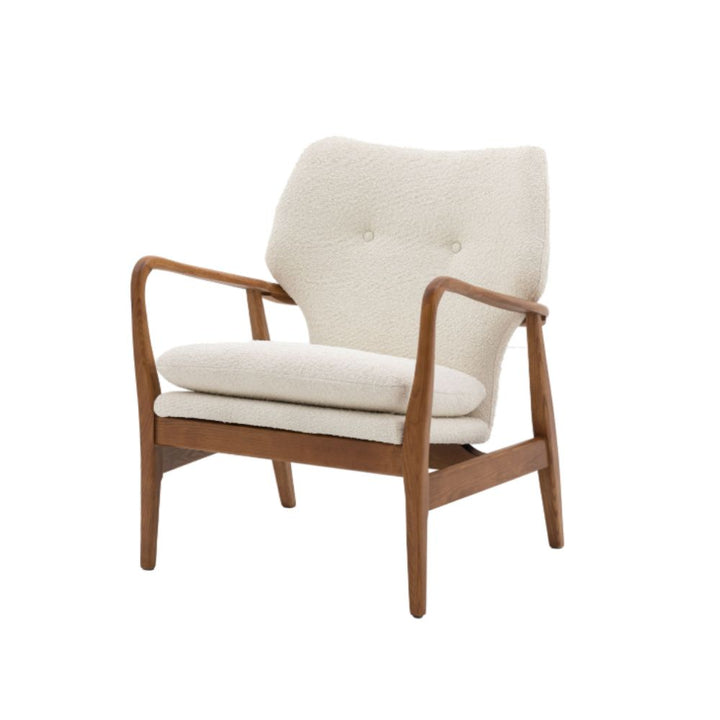 Jensen Cream Bouclé Armchair - Ex Display - The Jensen Armchair is a sophisticated addition to any interior, boasting a stunning solid ash wood frame and boucle with button details, complemented by a cushion of soft oak. This remarkable Mid-Century style chair is sure to be a showstopper in any...