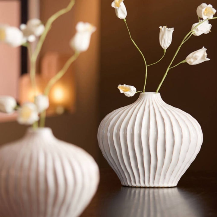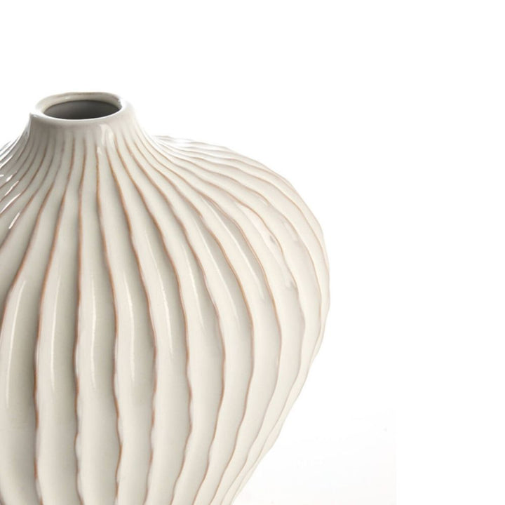 Lorina Cream Vase - The Lorina Cream Vase, made from fine ceramics, showcases a ribbed texture that enhances any room with subtle depth. Its neutral cream color provides a calming presence while offering a stable base for both fresh and dried flowers. This vase blends practicality with understated style, fitting...