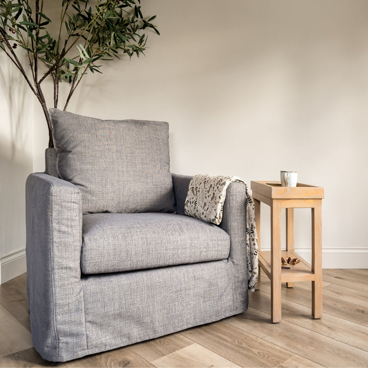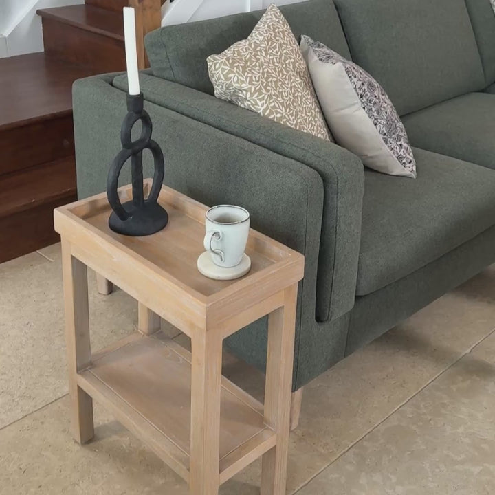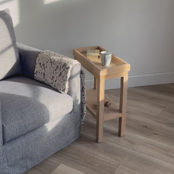 Mariella Oak Side Table - Indulge in luxury with the Mariella Side Table. Crafted from Indonesian oak, the sky grey oak finish exudes elegance. The tray top design and small shelf provide both style and functionality. Elevate your space with the Mariella. Key Features: Manufactured with Indonesian Oak Sky Grey...