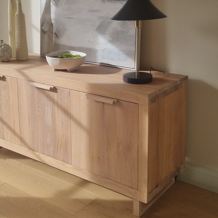 - Indulge in elegance with the Markese 3 Door Sideboard. This exquisite piece features 3 doors and spans 160cm, offering ample storage space with an internal shelf. Crafted from European oak wood, it adds a touch of sophistication to any room. Elevate your decor with this luxurious and timeless sideboard.