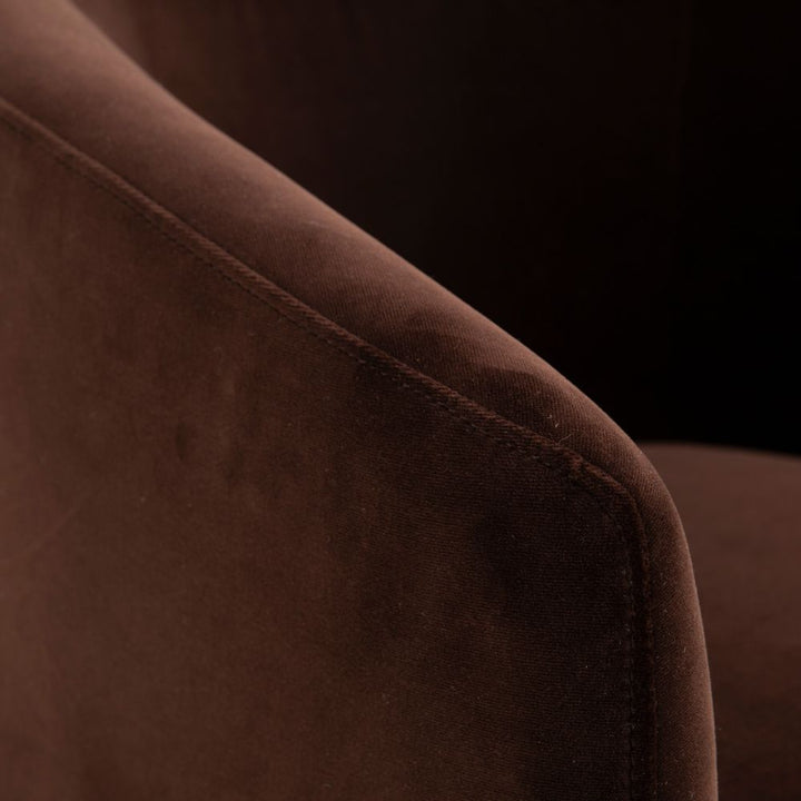 - Sink into comfort with this sophisticated velvet armchair, upholstered in rich chocolate brown that complements any interior. The curved arms wrap protectively around you, creating an enveloping embrace perfect for reading or relaxation. Anchored by a sturdy oak base, this piece combines timeless elegance with enduring quality. The sumptuous velvet texture invites touch while the warm wood tones add natural warmth to your space. An investment in both style and comfort that elevates your home's aesthetic.