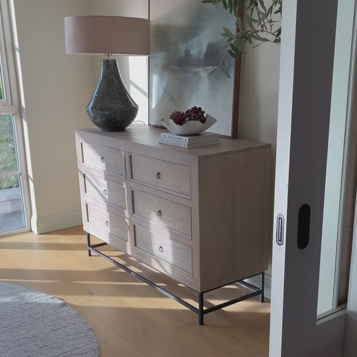 - Enhance your space with this luxurious 6 Drawer Chest. Made from premium Indonesian oak in a refined sky grey finish and featuring six ample drawers, this chest is both functional and stylish. The sleek black metal frame legs add a touch of sophistication to this elegant piece. Transform your space into a sophisticated oasis with this exclusive commode.