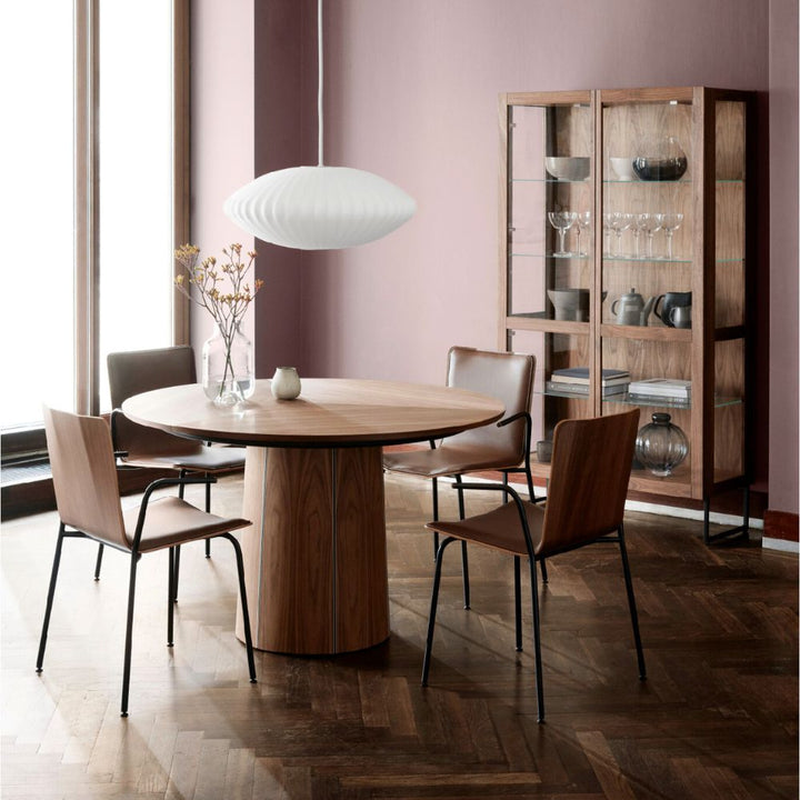 SKOVBY Round Dining Table #33 Ex-Display - Ex-display piece, it is advised to view before purchase. - A special extension system is included with the Skovby walnut dining table. The three leaves move synchronously to a position that frees up space for the extension leaves in the base by rotating...