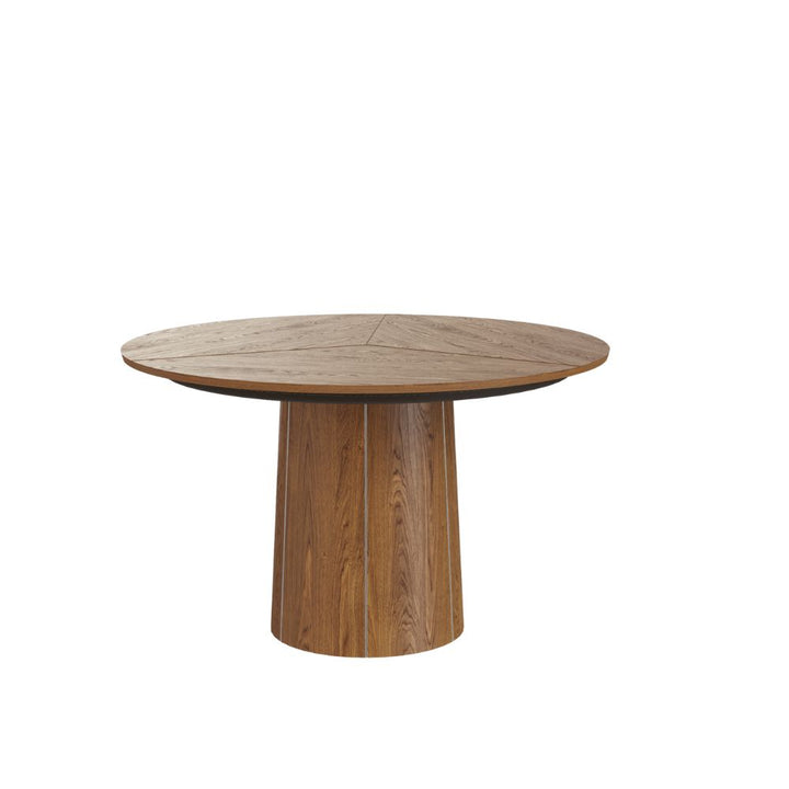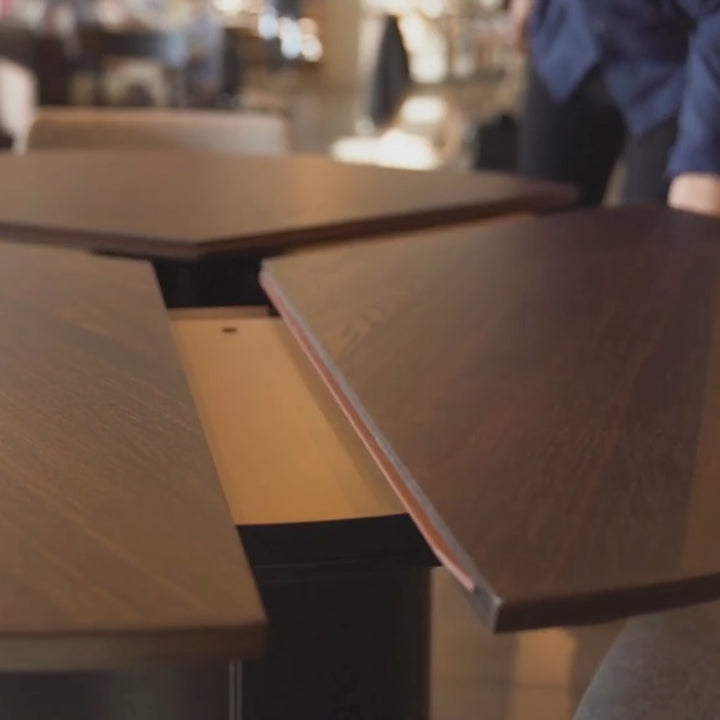 - A special extension system is included with the Skovby walnut dining table. The three leaves move synchronously to a position that frees up space for the extension leaves in the base by rotating the turntable underneath the tabletop. Through the use of a spring positioned beneath the triangle in the center of the table, the extension leaves unfurl when light pressure is applied. Six to nine people can be seated at the extended dining table.