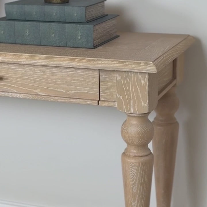 - The Story Console Table features a refined design with classically carved legs and two practical drawers for organised storage. Finished in a natural wood veneer that beautifully showcases wood grain detailing, it brings understated elegance and functionality to any entryway or living area.