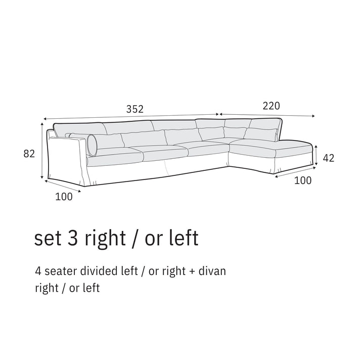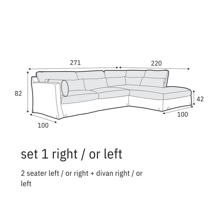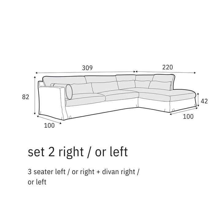 - As a customisable sofa, you may choose from a variety of dimensions, from 2 seater, to different formations of L shaped (see images below). You can also choose from a large variety of fabrics, which grade from 1 - 5, with grade 5 having the least amount of synthetics and the most natural fibres e.g linen. Fabrics can be viewed in our showroom.