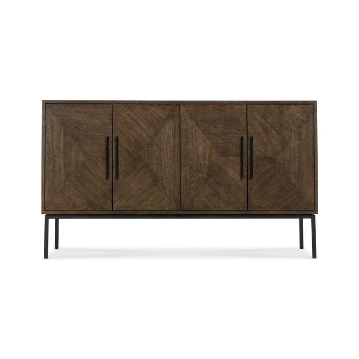 Dark Brown Sideboard - The Tutor 4 Door Sideboard combines sleek design with functional storage, featuring a dark brown wood veneer finish and striking black legs. Its geometrical pattern adds a modern touch, while four doors with internal shelving provide ample space to organize your essentials with style and sophistication....