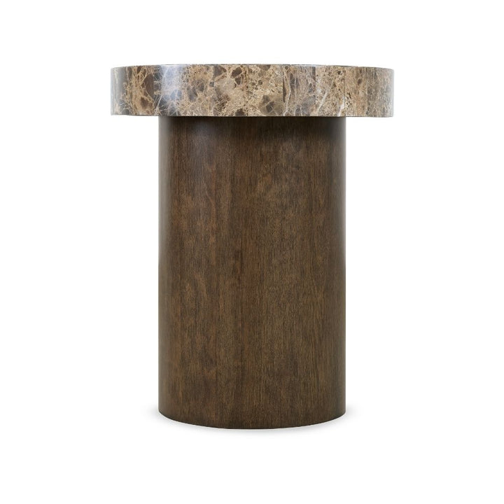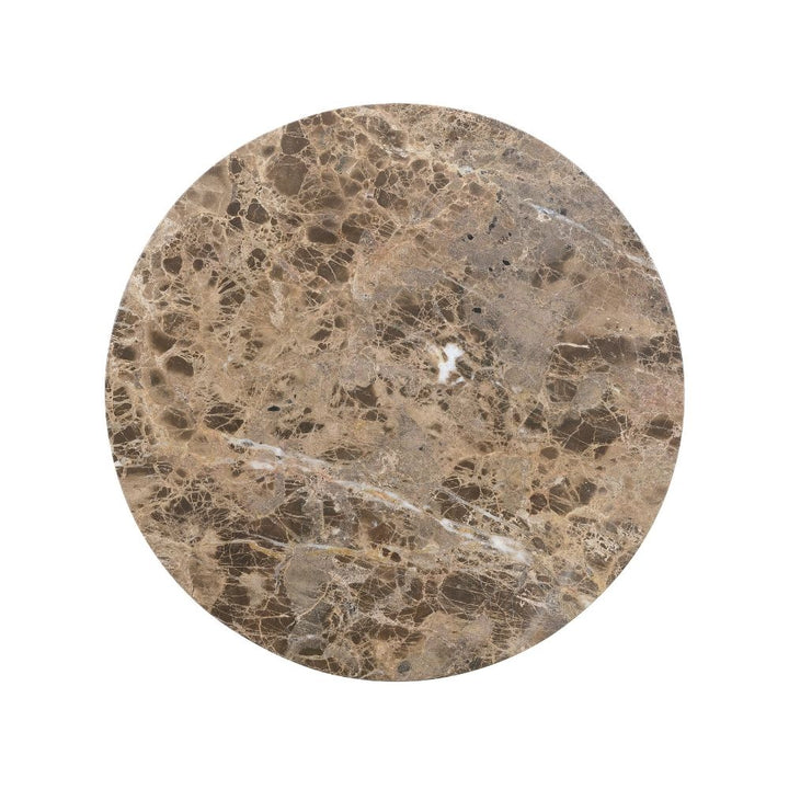 - The Tutor Round Stone Side Table combines a smooth stone top with a dark brown wood veneer base, creating a sophisticated accent for any room. Its elegant design and durable materials make it an ideal choice for adding both style and function to your living space.